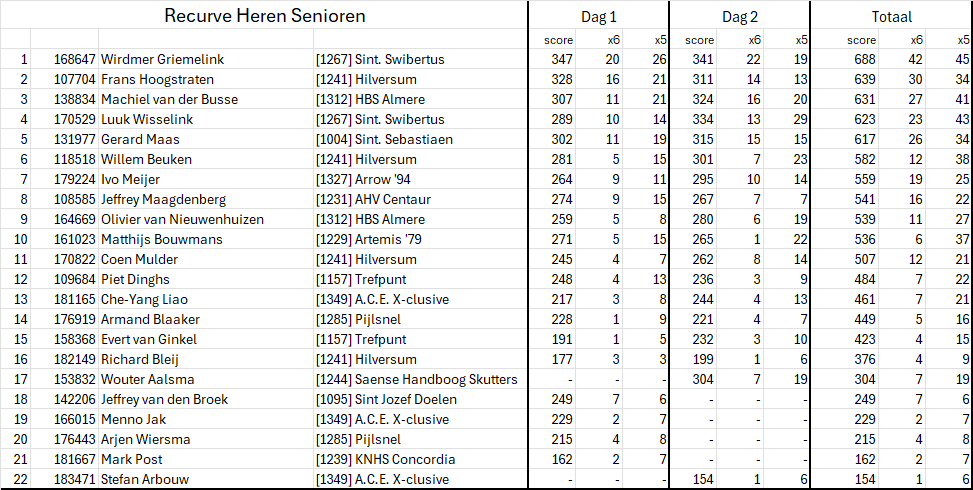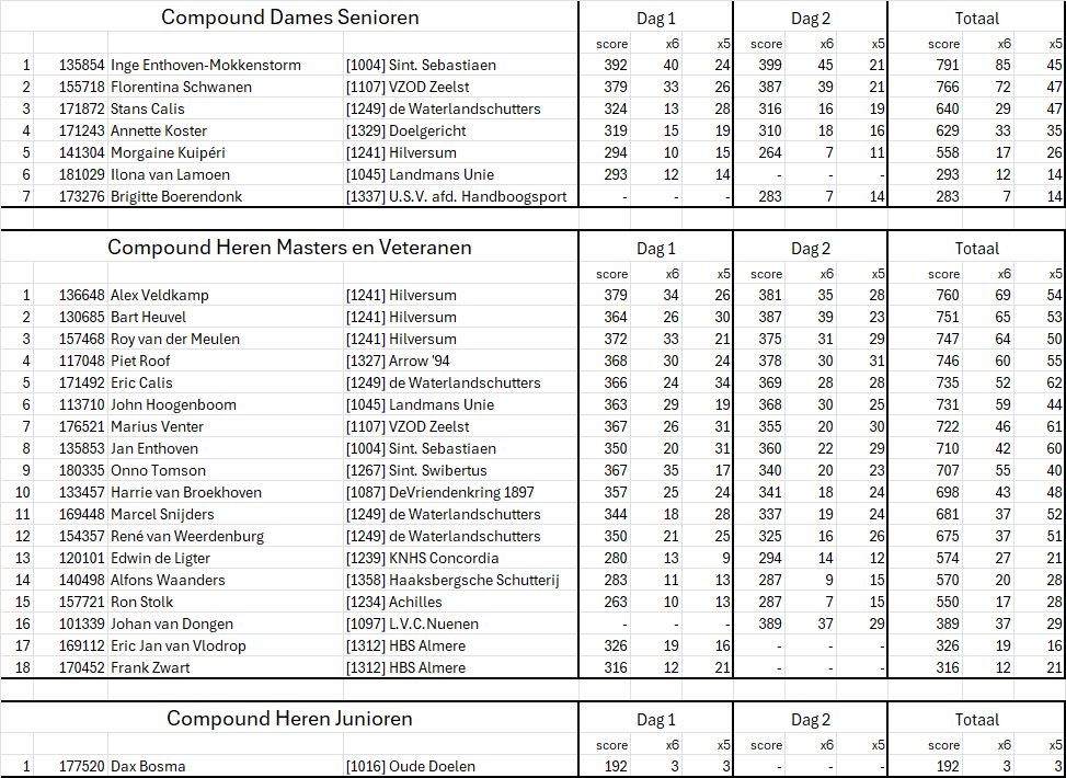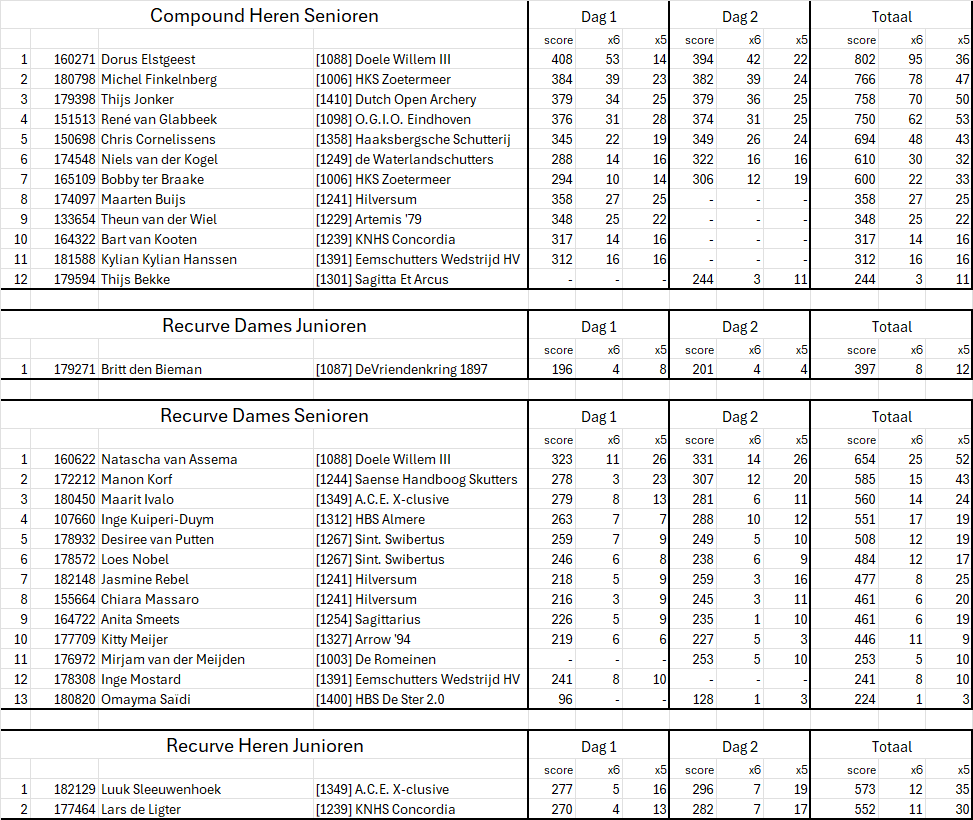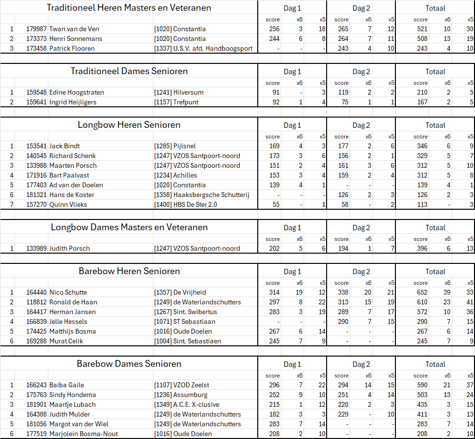 Onderstaand de uitslag van de dubbele arrowhead wedstrijd zoals verschoten op 14 en 15 juni 2025 in bos Brikhoven in Amersfoort